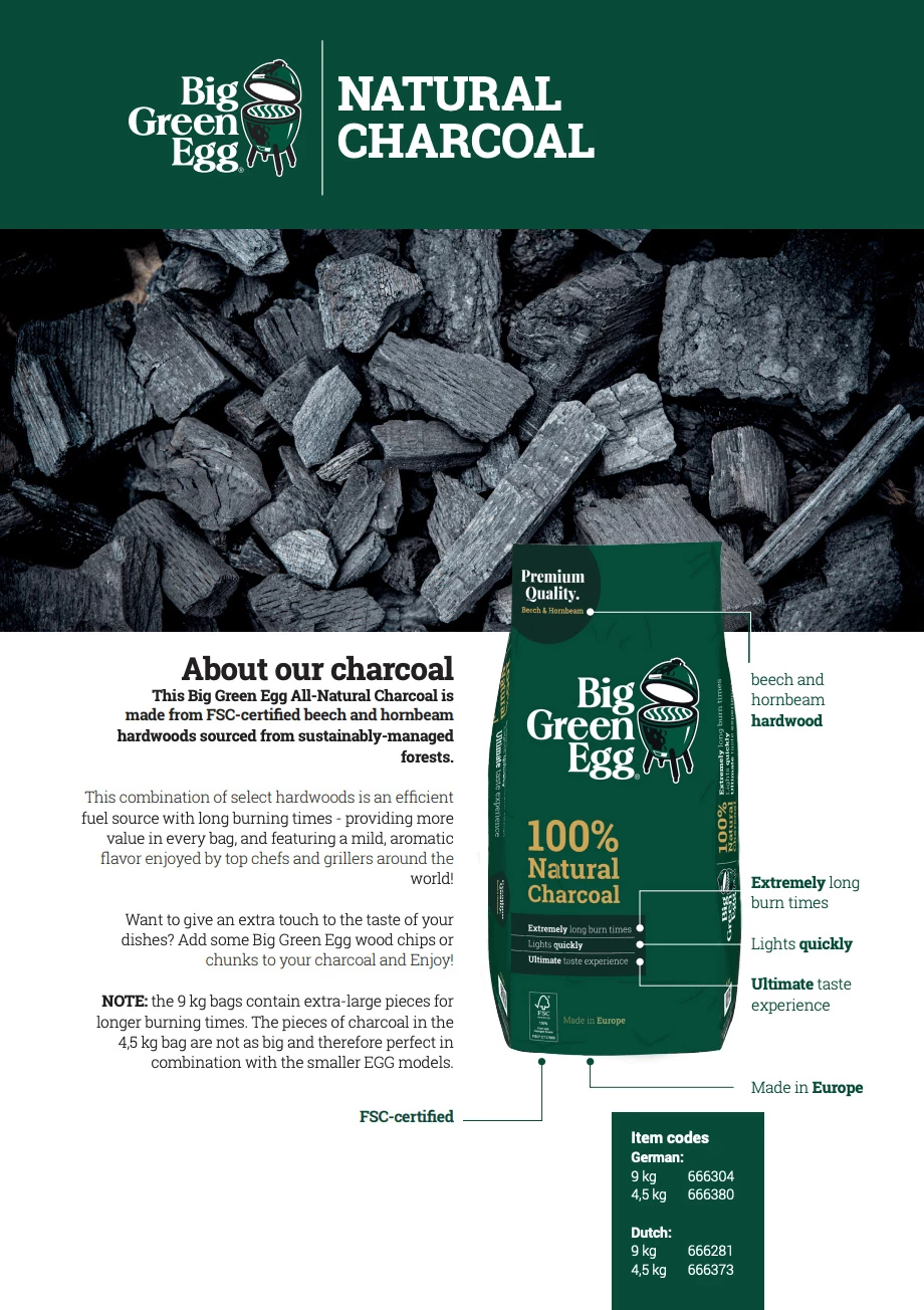 Iedere kooksessie begint met de juiste brandstof. Onze 100% natuurlijke houtskool met FSC keurmerk is precies wat je nodig hebt. Het Big Green Egg houtskool is afkomstig van de beuk en haagbeuk en heeft een extreem lange brandduur.