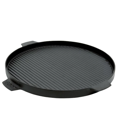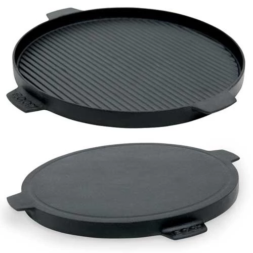 Het Big Green Egg gietijzeren plancha rooster heeft 2 zijden, de geribbelde zijde is voor kleine gerechten zoals gamba’s, vis of vlees en de platte zijde is ideaal voor het bakken van pannenkoeken, eitjes of toast.