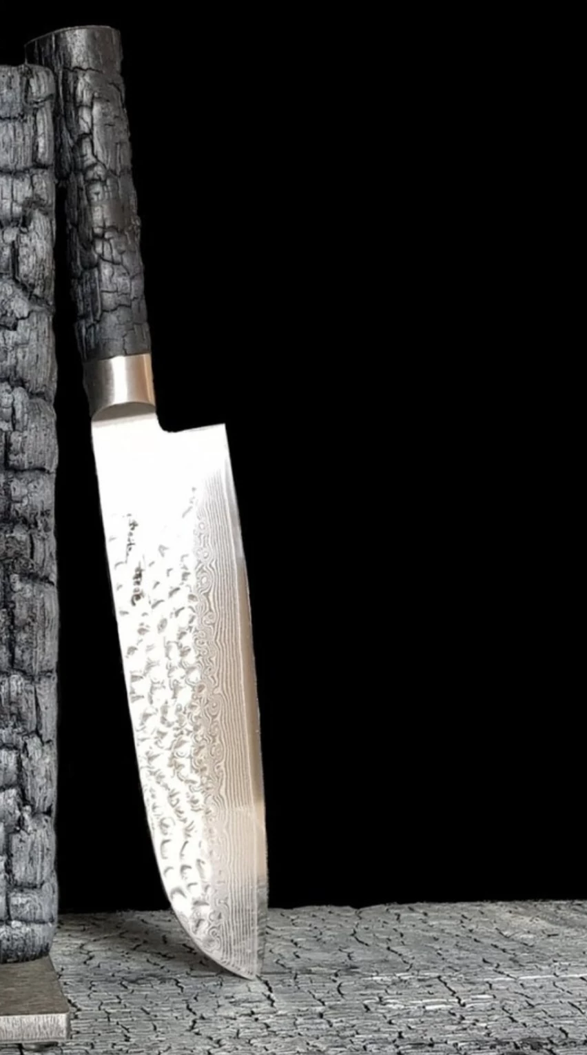 Uniek in de wereld zijn de mesheften en blokken gemaakt van gebrand hout. In een gepatenteerd proces wordt de gebrande laag geïmpregneerd met een kunststof om hem zijn sterkte te geven.