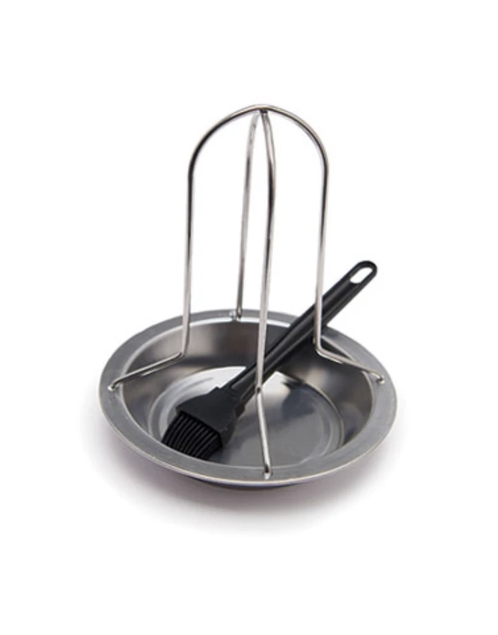 Het recept en de werkwijze zijn eenvoudig maar bijna altijd een succes. Plaats een bierblikje in de houder. Plaats de beugel weer terug in de schotel. Het rvs schoteltje vangt de sappen op en kan je gebruiken om krieltjes en groente in te bereiden. De set wordt geleverd inclusief een silicone kwastje waarmee je de kip kan bevochtigen.