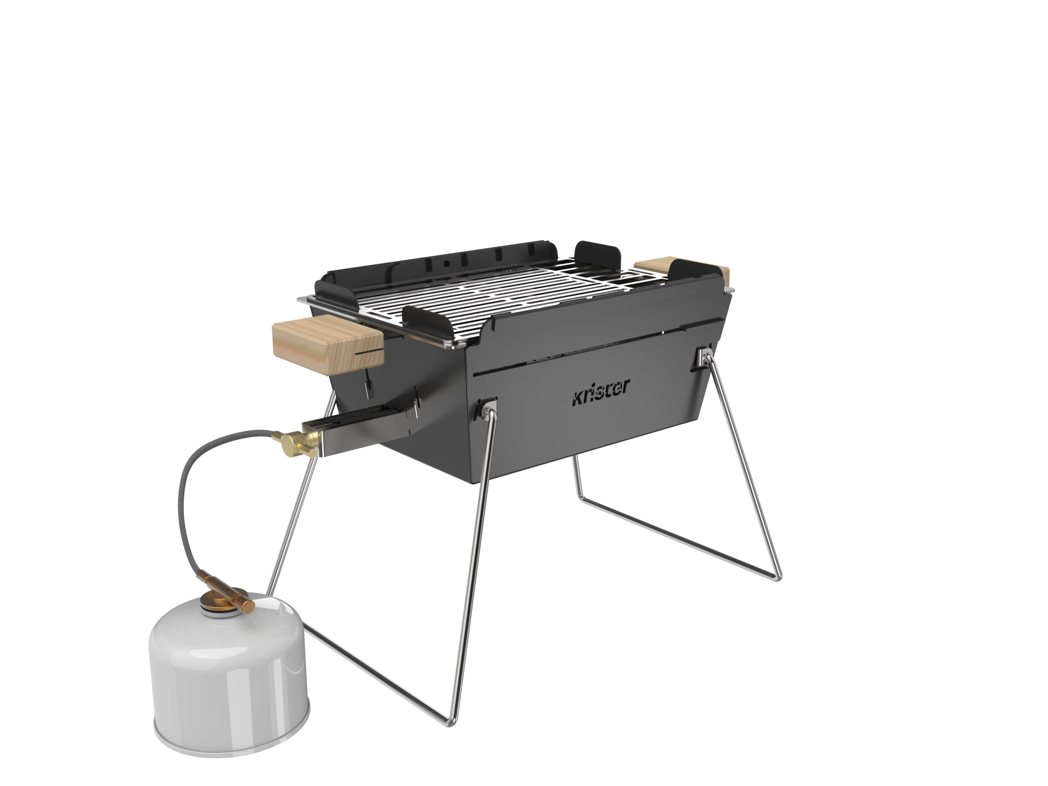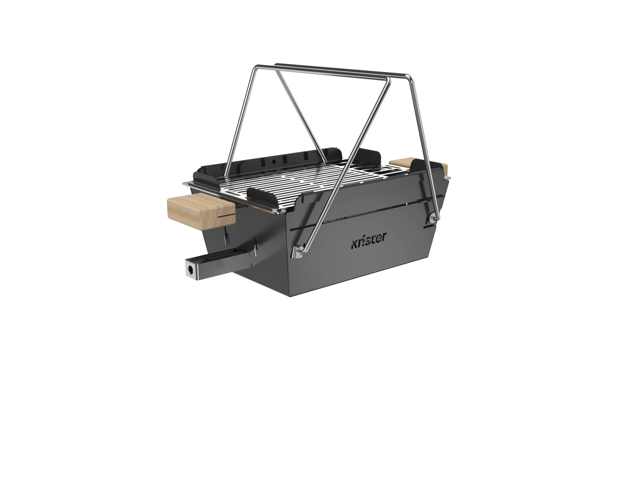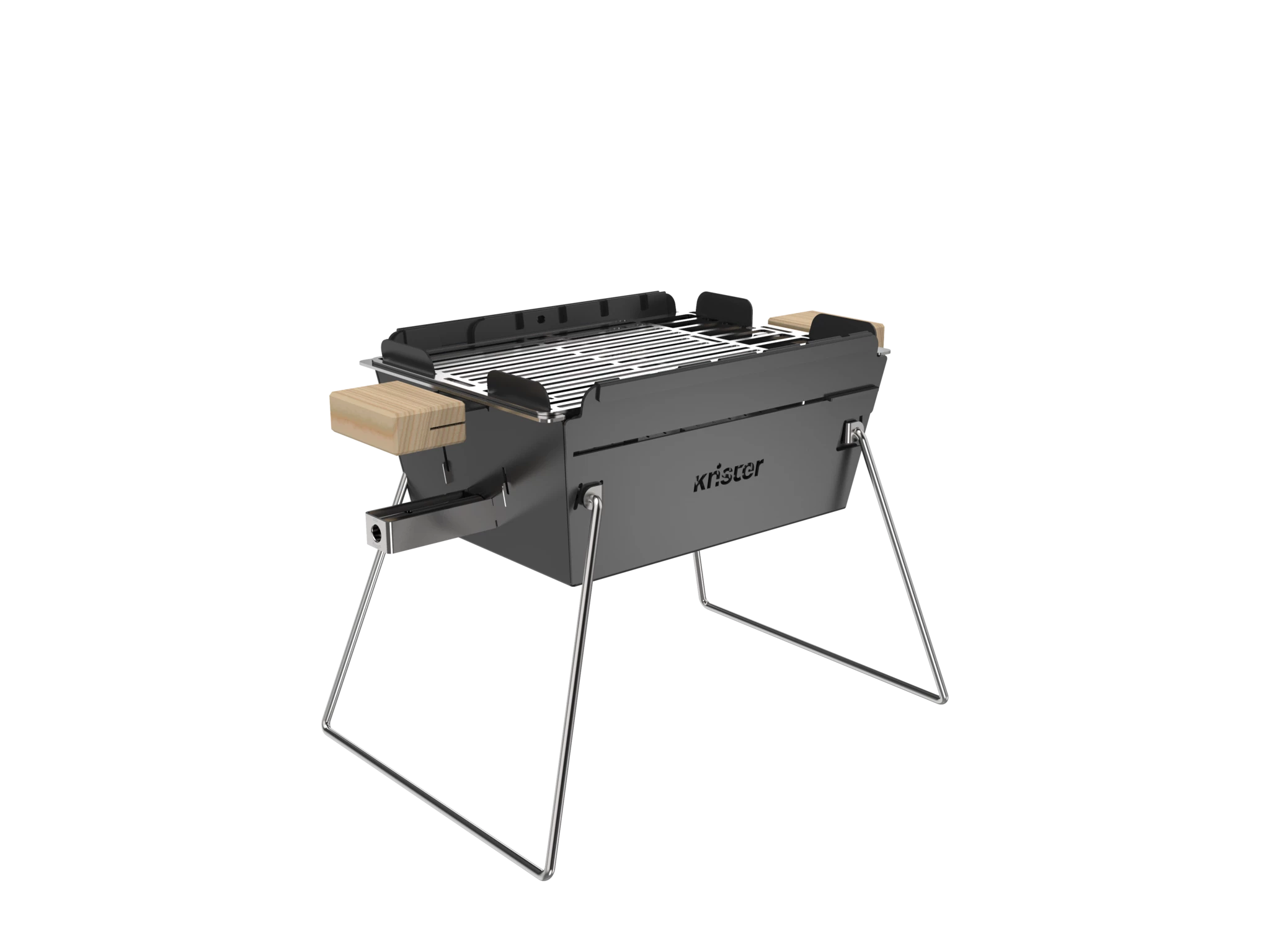 De Knister biedt tijdens het transport ruimte voor bijvoorbeeld kolen, voedsel of servetten. Eenmaal op de grilllocatie aangekomen pak je alles uit en kan je de Knister Grill uitschuiven tot tweemaal de maat. Hierdoor kan je voor 3-8 personen barbecueën.