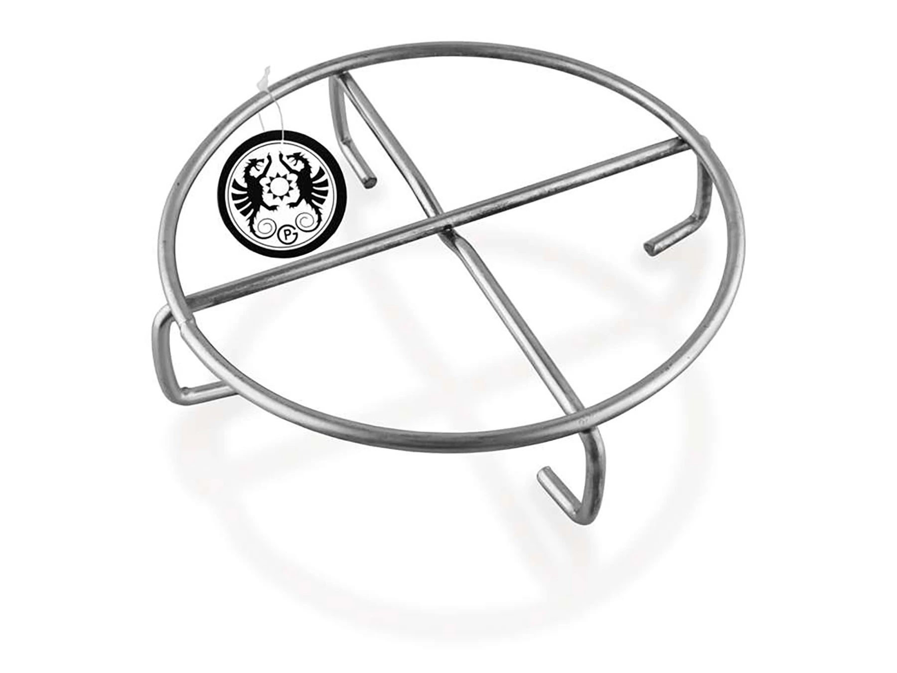 Een trivet is een metalen rooster of onderzetter die onder de Dutch oven wordt geplaatst om hem van direct contact met de hittebron, zoals kolen of open vuur, te isoleren. Ook kun jij met een trivet tijdens het koken de hete deksel of pan veilig en schoon wegleggen