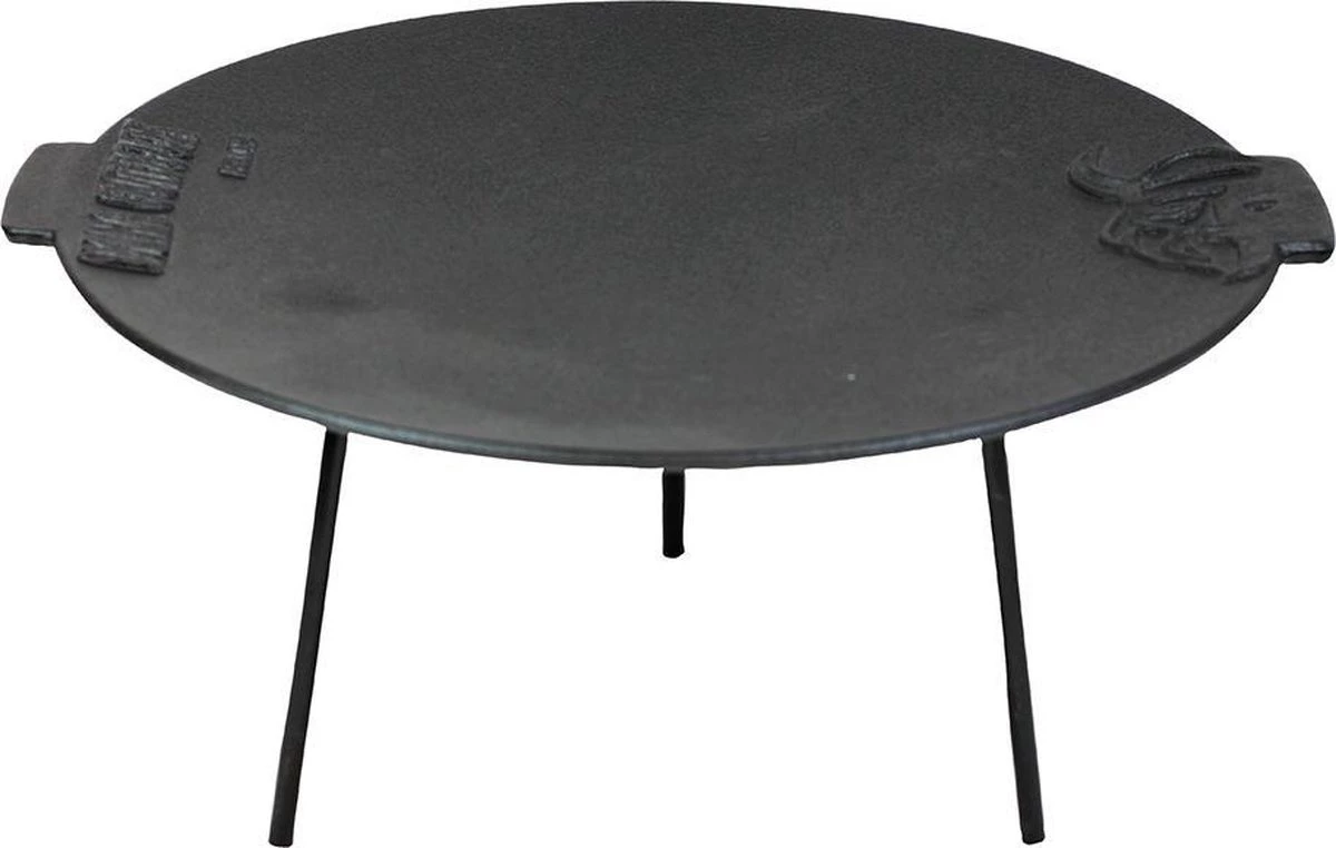 Vuurschaal en bakplaat in één. Gemaakt van gietijzer met stalen benen en een diameter van 44cm. Maak een kampvuur of plaats hem boven een kampvuur om te bakken en grillen. Ook handig onder een drie-poot waar vuur op de grond niet mogelijk is of plaats hem in een kampvuur en je kunt een heerlijk ontbijt maken.